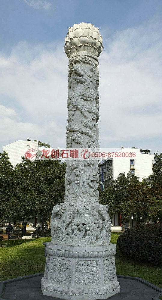 龍柱一般常見的都為石造浮雕華表,柱身圓形,雕有盤龍等紋飾,往往綜合運用立體圓雕,透雕和里地引起的淺浮雕等技法于一體。柱頭和華麗的八角底座及四周石欄桿雕凸起蜿蜒之行龍與四個角柱上蹲獅組合,襯托出龍柱浮雕特具的素滌華貴之美。