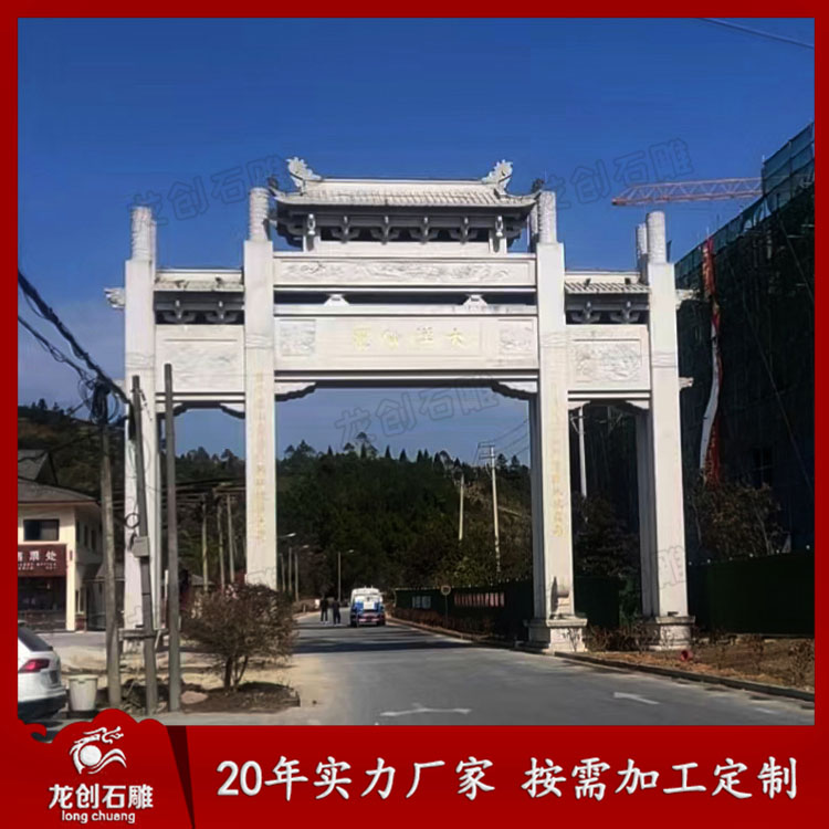 中西方風(fēng)格融合的現(xiàn)代造型設(shè)計(jì)石牌坊,選用傳統(tǒng)式的石牌坊制作樣式,在建筑類型上結(jié)合歐式古典的設(shè)計(jì)構(gòu)思,種風(fēng)格的牌坊看起來豪華而壯觀。許多現(xiàn)代化的鄉(xiāng)鎮(zhèn)喜歡選擇這種類型的牌坊。