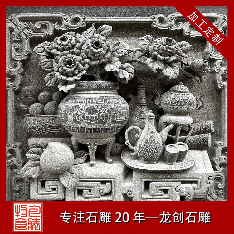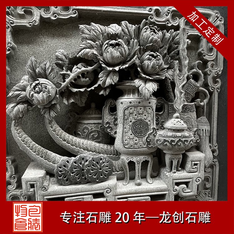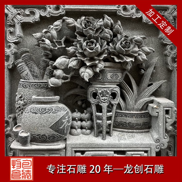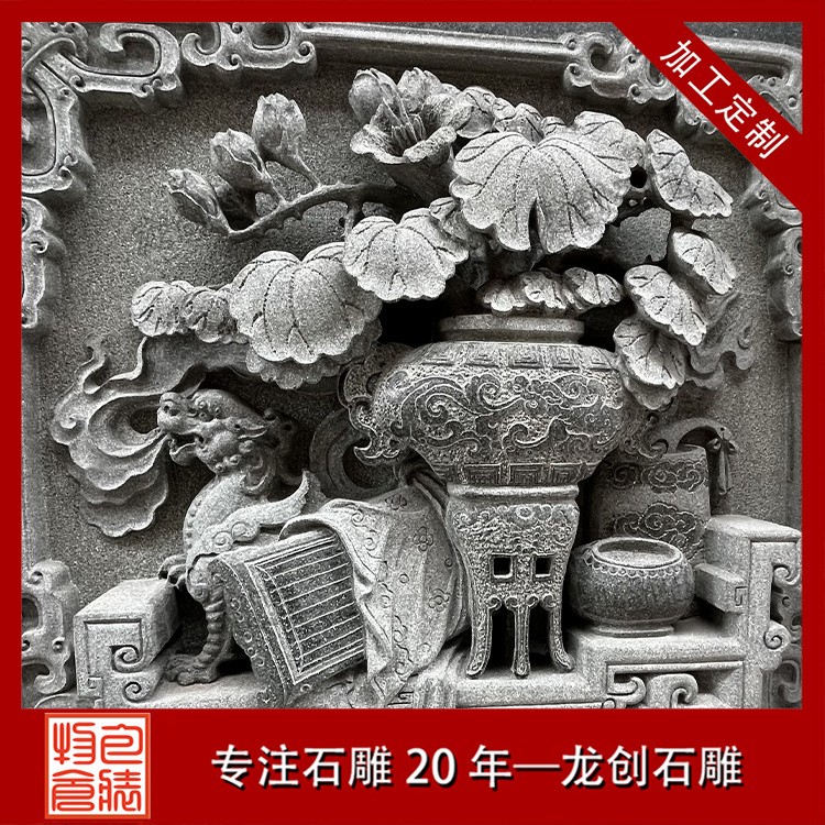 在工藝技法上,這類浮雕注重平面構圖向立體空間的轉(zhuǎn)換。采用寫實與寫意相結(jié)合的表現(xiàn)手法,花朵枝葉的形態(tài)力求準確,而整體布局則講究虛實相生。雕刻時通常分三個層次處理:遠景層淺刻勾勒,中景層適度凸起,近景層重點刻畫。特別是禽鳥的喙眼、花瓣的翻卷、葉片的脈絡等關鍵部位,通過精細的刀工呈現(xiàn)出生動的細節(jié)質(zhì)感,使堅硬的青石呈現(xiàn)出柔美的自然氣息。