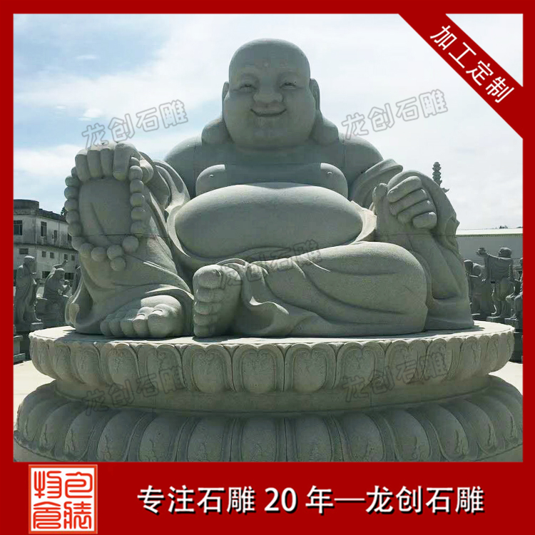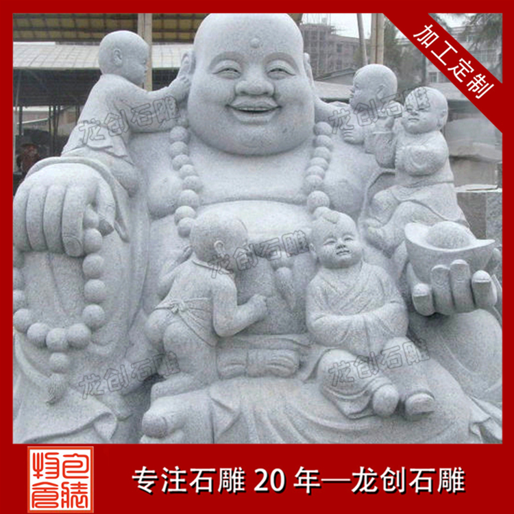石雕彌勒佛手中還有一乾坤袋,可容天下萬物,無所不有。佛爺以慈善為本,普度眾生,常以袋中之物施舍眾生,救苦救難,尤其是金銀財(cái)寶。所以世人若求消災(zāi)解難,富貴平安,那一定要在家中供奉彌勒佛。當(dāng)然無論你是否得到你想要的東西,都應(yīng)該笑對(duì)人生,做一個(gè)像佛爺一樣的樂天派。所謂一笑解千愁。人們見此佛像,往往受他那坦蕩的笑容感染而忘卻自身的煩惱。很多寺院的彌勒殿還有這樣一幅對(duì)聯(lián):大肚能容,容天下難容之事;開口便笑,笑世間可笑之人。