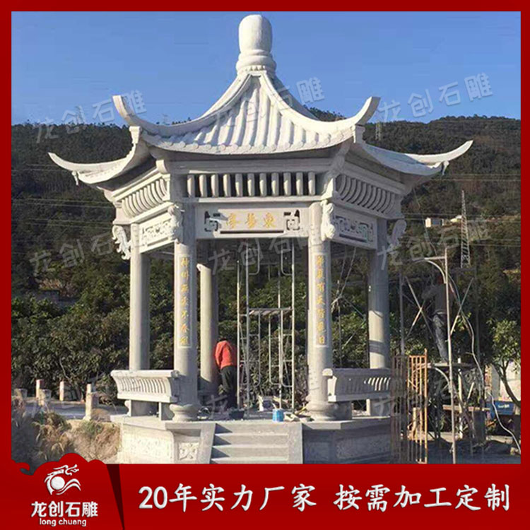 惠安涼亭石雕定制是指用石頭加工而成的亭子,多建于路旁,供行人休息、納涼或觀景用。石雕亭子一般為開(kāi)敞性構(gòu)造,沒(méi)有圍墻,頂部可分為六角、八角、圓形等多種形狀。其材質(zhì)多選用青石、花崗巖、草白玉等。至于石雕亭子多少錢?就要看客戶要多少價(jià)位的亭子了,是3萬(wàn)、5萬(wàn)還是10幾萬(wàn)等等,我們惠安龍創(chuàng)石雕都可以定制。