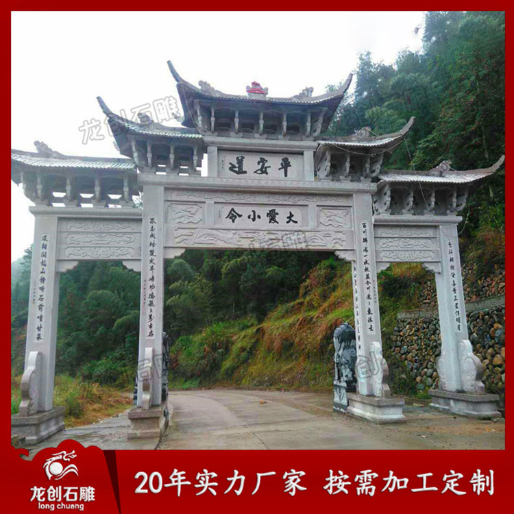 村口牌坊牌樓作為提升農(nóng)村形象的重要建筑物,在選擇上要綜合考慮,農(nóng)村修建村口門樓一般以簡單大方為主,而村口門樓分為有樓的和沒樓的兩種樣式,門數(shù)又分為一門石牌樓、三門石牌樓、五門石牌樓等。村口門樓一般一門一樓三樓或三門三樓五樓七樓較為常見,五門的很少見。石牌樓常見的這幾種樣式也是農(nóng)村人都非常喜歡的,原因一簡單大方,原因二價(jià)格實(shí)惠,這兩點(diǎn)很重要。