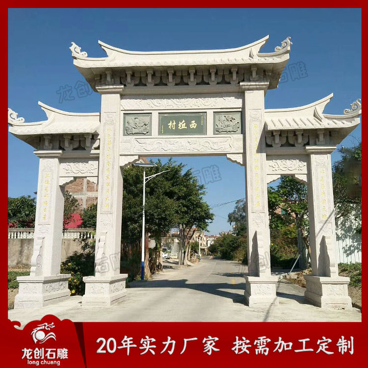 村口牌坊牌樓石雕的興起是一種盛世的象征。村口石牌樓體現(xiàn)了農(nóng)村經(jīng)濟(jì)繁榮、設(shè)施完善、環(huán)境優(yōu)美、文明和諧的社會(huì)主義新農(nóng)村的核心價(jià)值,這也是社會(huì)主義新農(nóng)村建設(shè)的成功見證之一。