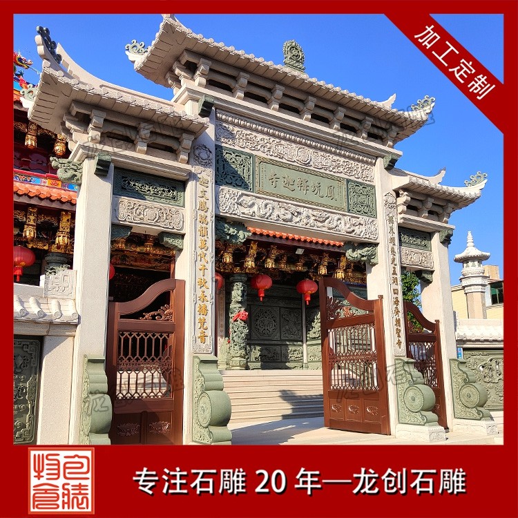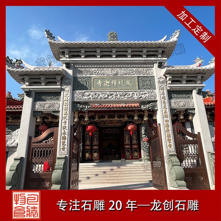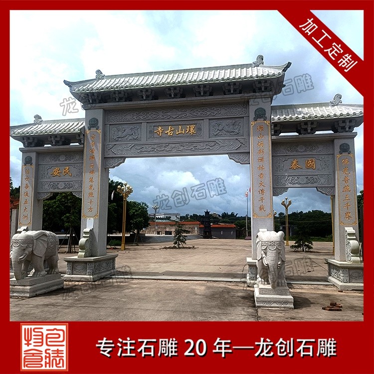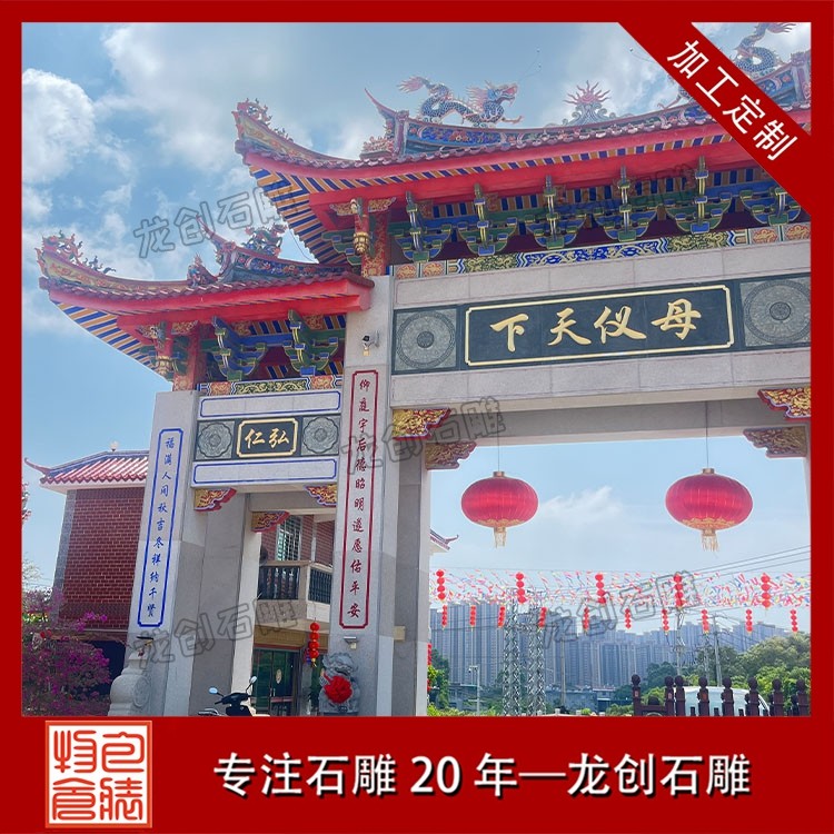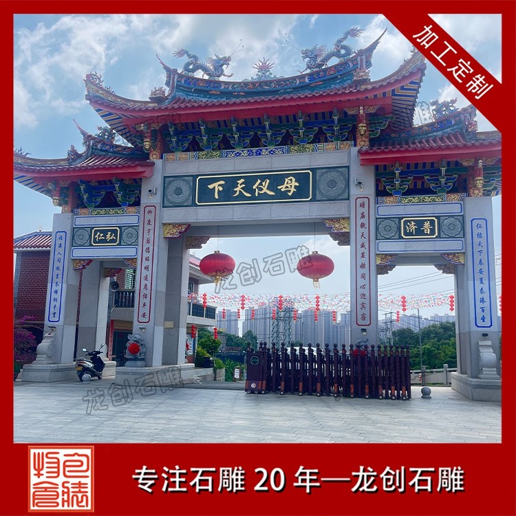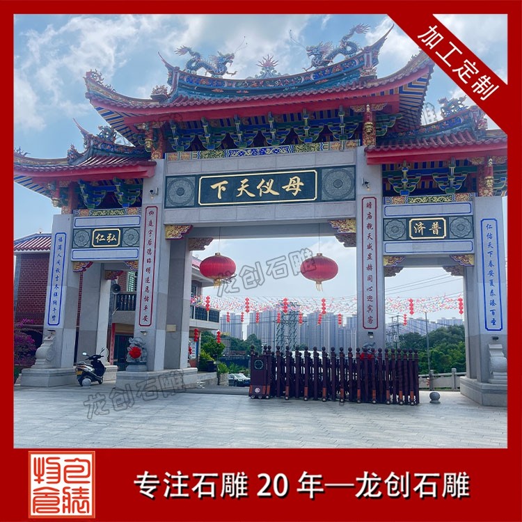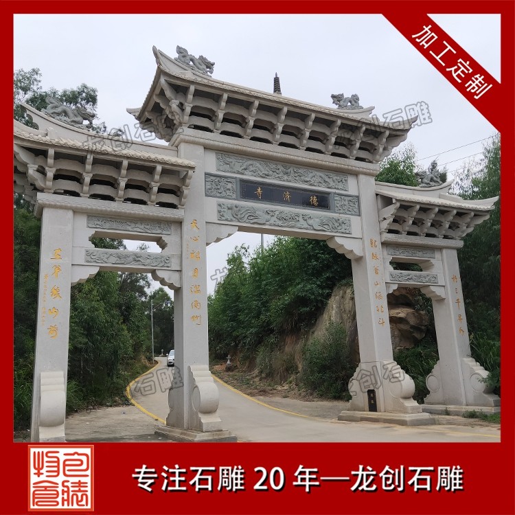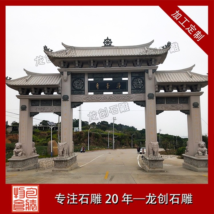 寺廟牌坊的風格通常更為莊重古樸,色彩素雅,營造出一種肅穆的氛圍。當信徒或游客穿過牌坊的那一刻,仿佛從喧囂的俗世踏入了一片清涼圣境,世俗的煩惱被拋在身后,內(nèi)心自然而然地生出敬畏與虔誠 。牌坊上的雕刻也極具宗教特色,常見的圖案不是凡間的飛禽走獸,而是具有佛教寓意的蓮花(象征圣潔)、八寶(象征吉祥) 等。它既是寺廟的標志,也是引導眾生走向覺悟的精神前奏 。