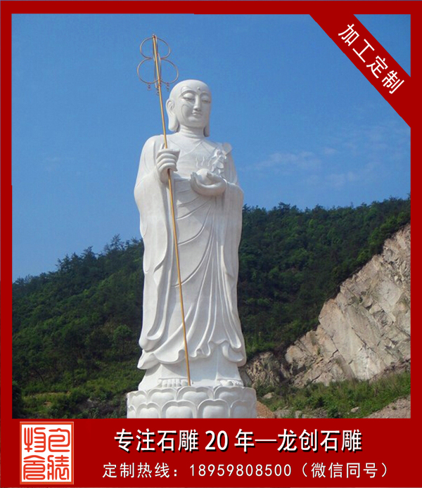 中國佛教寺院中的地藏菩薩形象很有特點(diǎn),一般菩薩為頭戴寶冠、身披天衣、瓔珞裝飾的天人相。而地藏菩薩則多為光頭或是頭戴毗盧冠,身披袈裟的出家僧人之相。一手持錫杖,一手持蓮花,或是手持幡幢、寶珠等。