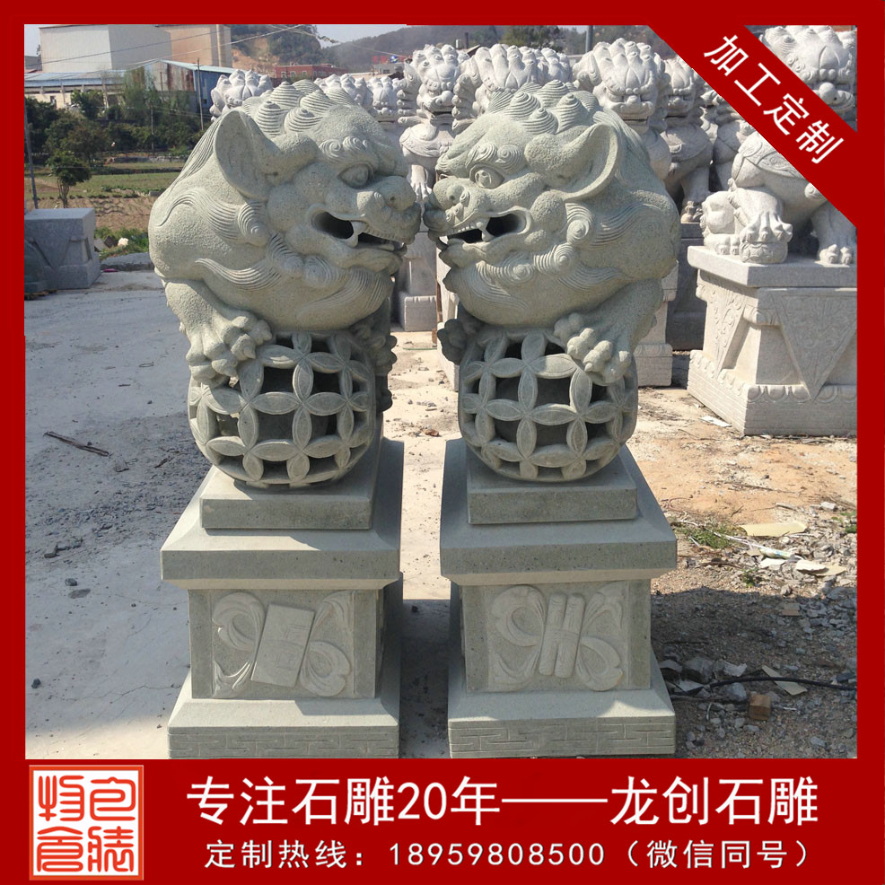 石獅子的造型一般尊嚴(yán)而又大氣,是皇jia守衛(wèi)門戶確保皇宮安寧的瑞獸,因為獅子是獸中zhi王,它體態(tài)壯碩雄健、威錳無比、氣勢非常。統(tǒng)治者認(rèn)為獅子不但可以避邪,還可帶來祥瑞之氣。石雕北京獅為雌雄一對,獅頭飾鬃髦,頸懸響鈴,肌肉發(fā)達(dá),氣勢雄偉。雌獅前左腳下有一幼獅仰臥作嬉戲狀,雄獅前右腳撫踩一繡球。底座有繁縟精致的卷葉紋。石雕北京獅瑞獸一種,百獸zhi王,勇不可擋,威震四方,不但可以避邪,且可帶來祥瑞之氣,能解除多種形煞,亦加強官威或屋主之陽氣,如果窗口見到不利之沖克,如沖煞、天斬煞等,可放一對石獅面向口可化煞,且有生權(quán)之意,適合官職人員擺放,古時衙門前就是擺放獅子鎮(zhèn)守。