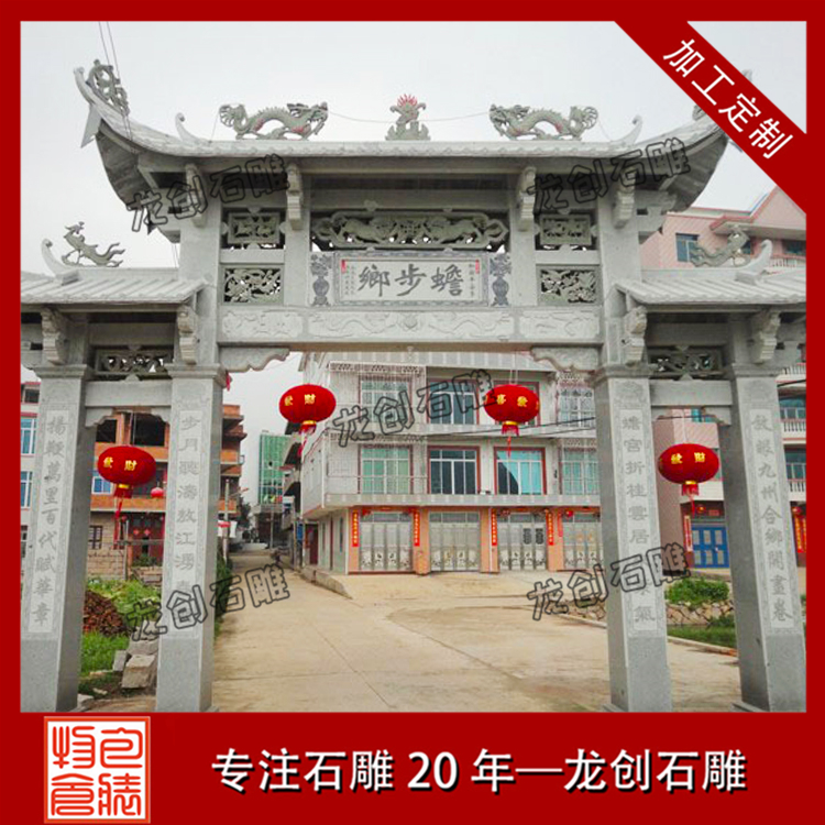 農(nóng)村大門牌坊定做當(dāng)然在材質(zhì)的選擇上都比較講究,為保障牌坊本身的美觀性和牢固性,在材料挑選上也都有非常高的要求。綜合現(xiàn)在牌坊的雕刻看,主要用料有青石、花崗石、大理石等,要說比較合適的牌坊雕刻用料,還是以花崗石為主,花崗石的材質(zhì)比較堅固,花色也都比較多,能夠雕刻出更為細致的村口牌坊作品。