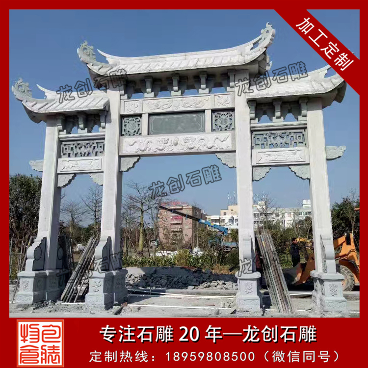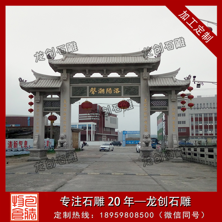 龍創(chuàng)石雕,專業(yè)的青石牌坊制作廠家,現(xiàn)有出售青石三門三樓、青石三門五樓、三門七樓等樣式的石牌坊,同是也承接來圖來樣定制,歡迎來電咨詢。