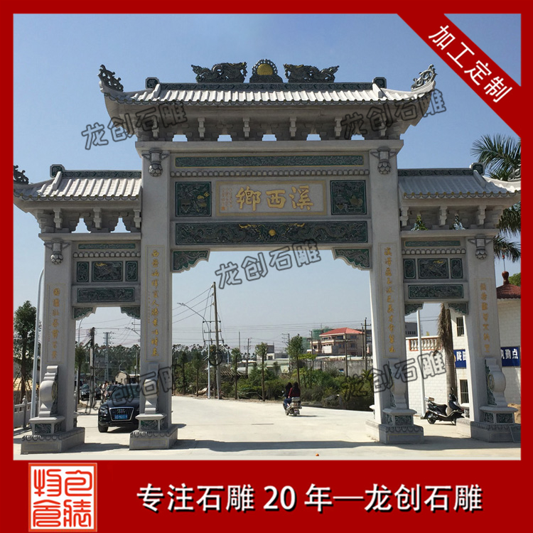 村口石牌坊定制加工浮雕有祥龍、麒麟、吉祥大象等,石獅子位置是石牌坊抱鼓石的位置,在石牌坊主體建筑門前人們不抬頭也可以一眼就看到,不僅很好地映襯和裝飾了進(jìn)村牌坊主體建筑,而且更地塑造了整個(gè)村莊的吉祥文化氣氛。古人生活在一個(gè)易受自然災(zāi)害侵襲和其他不確定因素侵犯的環(huán)境中,需要這種“進(jìn)村石牌坊布局加以保護(hù),進(jìn)村牌坊雕刻具有寧靜、安詳?shù)奶攸c(diǎn)。進(jìn)村牌坊上的守門石獅的設(shè)置正是對這一特征的強(qiáng)化,是古人追求平靜祥和這一心理特征的側(cè)面反映。