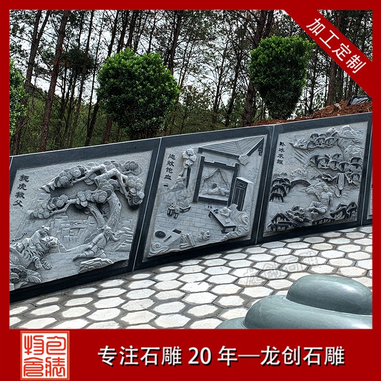 在墓園會(huì)使用到的石雕制品有很多,除了我們一開始會(huì)想到的石雕墓碑以外,還有些墓園會(huì)安裝石雕欄桿和石雕涼亭、石雕浮雕,墓園石雕欄桿除了起到安全防護(hù)作用外,還具有裝飾作用,而石雕涼亭的主要作用就是供人休息用的,石雕浮雕主要作用就是裝飾了,此套石雕墓圍的浮雕圖案是二十四孝。