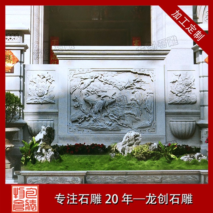 市場上浮雕石材背景墻加工較常見的天然石材浮雕有花崗巖浮雕和大理石浮雕。花崗巖浮雕從才是來說是一種硬度比較高的石雕,因此它更具有耐磨性,保存也更久,所以它所應用到的場所室內室外都可以。而大理石的材質結構疏松,質地相對比較軟,所以它的耐磨性較差,如果應用在室外就比較容易受自然災害破壞。
