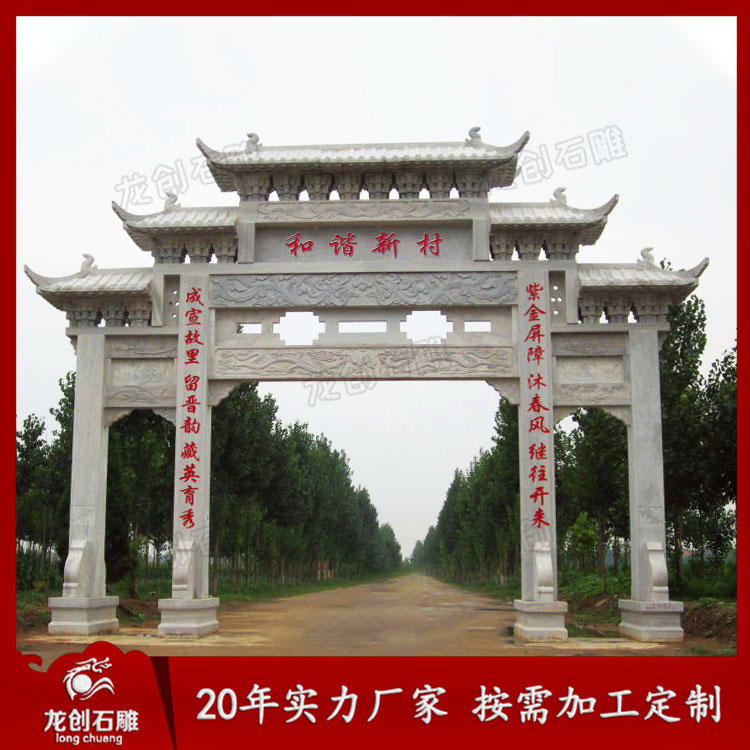 三門石雕牌坊在農(nóng)村地區(qū)也是比較常見的,三門五樓牌坊定制也比較多,尤其是現(xiàn)代一些新農(nóng)村建設(shè)中更是經(jīng)常可以看到這類三門石牌坊設(shè)計的農(nóng)村石牌坊。農(nóng)村地區(qū)的牌坊通常起到了標志地名以及裝飾性作用,在實際雕刻的時候應當要考慮到農(nóng)村地區(qū)的特色以及風土人情等情況,從而能夠雕刻出更為精致的石雕牌坊作品,展現(xiàn)牌坊的建筑之美。