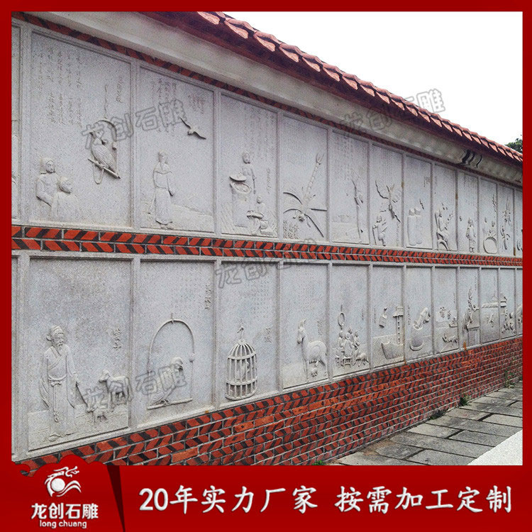 佛教寺廟浮雕文化墻所雕刻的內(nèi)容涵蓋了許多方面,有的是寺院的歷史沿革,有的是諸佛菩薩的經(jīng)典典故,有的則是佛像浮雕、寺院供奉主佛、菩薩的一些人物故事,這些所稱的故事中必然是在佛經(jīng)中有明確記載的。這種浮雕文化墻一般會(huì)采用青石或芝麻黑花崗巖石料,是因?yàn)檫@些石材的顏色相對(duì)深一些。在雕刻較多的人物形象時(shí),可以清晰地體現(xiàn)出來,包括人物的每一個(gè)動(dòng)作,而這是其他石材沒辦法達(dá)到的效果。
